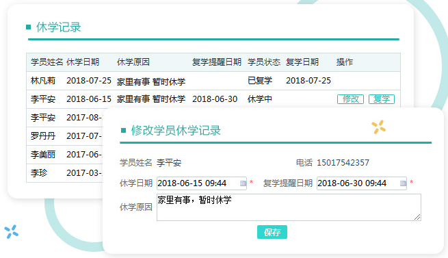 学员考勤查询小型机构学员管理系统可以支持多种查询方式,帮您更加快速迅捷的了解学校的考勤情况。培训查询可以查询当前刷卡学员的培训记录,预约查询可以查询当前学员的预约记录,丢时查询可以查询某段时间内学员的丢时记录,以上查询出的结果均可以导出,以对学员在上课期间请假或者没来上课等出勤情况的统计,方便教师及时了解学员的上课情况。