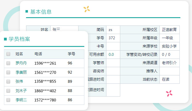 软件中的模块可以按照培训学校不同的管理模式进行,比如说:一对一管理模式、大小班管理、按照课程分班管理学员,从学员报班、缴费、票据打印、分班、排课一气呵成,同时学员考勤管理通过刷卡的方式实现考勤,对于成绩管理、课时管理都是可以直接通过搜索找到哪位学生的信息,方便快捷实现学员管理,提高工作效率。